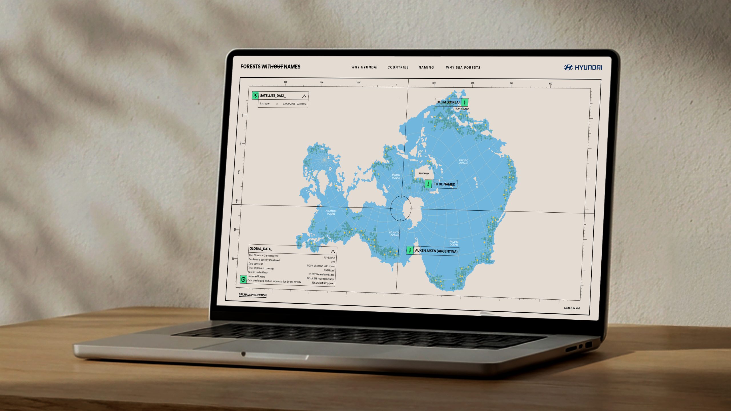Za razliku od poznatih kopnenih šuma, mnoge morske šume nemaju službena imena, a ta anonimnost ograničava njihovu vidljivost i zaštitu. Hyundai kampanja rješava ovaj problem dajući im jasne identitete. Imenovanje obuhvaća tri morske šume diljem svijeta. U Južnoj Koreji, jedna od obnovljenih šuma u Ulsanu dobila je ime “Ullim”, što na korejskom evocira odjek, i to kroz proces proveden u suradnji s nadležnim agencijama i ministarstvima. U Argentini je, uz pomoć lokalnih udruga, šuma nazvana “Auken Aiken”, što na jeziku tamošnjih starosjedilaca znači “Polje života”. Za šumu u Australiji, konačno ime odabrat će se putem javnog glasovanja na društvenim mrežama i web stranici kampanje.